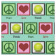 Aquamarine Tennisbeläge, bedeckt mit Friedensschildern, Herz und Tennisbällen.
