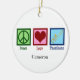 Custom Peace Liebe Trombone Weihnachtsschmuck für ein Mitglied der Marschband, die Lieben spielen ein Messinginstrument. Ein niedliches Friedenszeichen, Herz und Posaune auf einem personalisierten Geschenk.