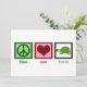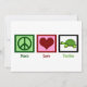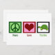 Ein grünes Friedensschild, ein Herz und eine bezaubernde Schildkröte auf einer niedlichen Grußkarte. Peace Liebe Schildkröten Karten.