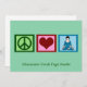 Peace Liebe Yoga auf einer schönen grünen Urlaubskarte mit Ihrem individuellen Text unten. Schicken Sie diese hübschen Karten für die Ferien oder Weihnachten. Auf dieser niedlichen Grußkarte befinden sich ein Friedensschild, ein Herz und jemand in einer Yoga-Pose.