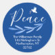 Entdecken Sie die auffallend blauen und weißen "Peace"-Holiday-Script-Sticker für klassische Rundschüsse, die in 1,5-Zoll-Kreisen mit 20 Stück erhältlich sind, oder in einem größeren 3-Zoll-Quadrat- oder Kreisformat.