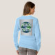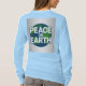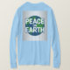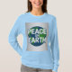 This t-shirt features the text PEACE ON EARTH in large white capital letters on a dark blue circular globe. The text s arranged in three lines, with PEACE on top, ON in the middle, and EARTH" at the bottom. The circular background is a stylized globe showing green landmasses and blue oceans. The design is set against a silver gradient background that fades to darker silver at the edges. The t-shirt is a women's long sleeve light blue t-shirt. The shirt is made of 100% cotton.