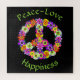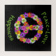 Dieses Puzzle mit rosa, gelben, orangefarbenen, lila, grünen, weißen und schwarzen Blütentönen zeichnet sich durch ein Blumenzeichen aus. "Frieden, Liebe und Glück" umgeben das Friedenszeichen.
