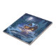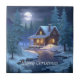 A peaceful scene in a snowy winter forest. A cozy cabin with warm light glowing in its windows, Christmas lights on its porch roof and a wreath on its door sits under a full moon surrounded by tall pine trees.