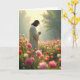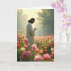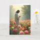 This card shows a calm garden scene where a single figure with long dark hair stands in profile among a sea of flowers 🌷. They wear a flowing, light robe, with their head gently bowed and hands held together, as if sharing a quiet promise with someone just out of frame. Soft golden light from early or late day outlines their hair and shoulders, giving the moment a tender, close-to-the-heart feel. In the lower front area, a short greeting appears in small, pale lettering, placed low and centered so it doesn’t distract from the scene. The foreground blossoms are softly blurred while the figure stays crisp, drawing your eye inward like you’re stepping closer. Across the middle ground, clusters of pink, white, red, and orange blooms spread out in varied shapes, with a few bunny-like silhouettes tucked between petals 🐇. In the distance, hazy tree shapes sit under a warm glow, and the flowers form a colorful carpet around the robed figure.
