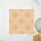Hexagonal floral pattern with blue-green centers and orange outlines on a peach background. White lines connect the shapes, creating a geometric grid.