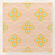 Hexagonal floral pattern with blue-green centers and orange outlines on a peach background. White lines connect the shapes, creating a geometric grid.