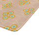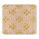 Hexagonal floral pattern with blue-green centers and orange outlines on a peach background. White lines connect the shapes, creating a geometric grid.