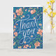 originelle Illustration und Schrift von Becky Nimoy "Danke" in weiß kursiv über blau mit pfirsichfarbenen Blume.