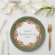 Elegante und rustikale boho Peach Watercolor Blume Wreath Bridal Luncheon Papier Teller mit einem sage grünen Rand und der Name und Datum der Braut personalisiert in einem skurrilen Wirblen Drehbuch Schriftart.