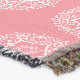 Dieses weiße Mandala sitzt auf einem pfirsichrosa Hintergrund. Die Farben sind blumig und hell. Teil der Sammlung Jarn Mandala.