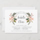 Chic florale Taufe, Taufe oder Widmungseinladung kennzeichnet den Namen Ihres kleinen Mädchens in eleganter Kalligrafie-Schrift, gerahmt von pfirsichfarbenen und rot-rosa Blume, Knospen und Grün. Personalisieren Sie Ihre Veranstaltungsdetails darunter, einschließlich Platz für die religiöse Zeremonie und Feiern oder Party.