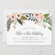 Chic-Blumengeburtstag-Einladungen zum ersten Geburtstag, Kindergeburtstag oder jedes Alter, mit einer kaskadierten oberen Grenze von rot-pink und pfirsichfarbenen Blume mit üppiger botanischer Vegetation. Personalisieren Sie Ihre Geburtstagsparty-Details in schwarz-schwarz-farbenen Serifen und kalligraphischen Schriften.