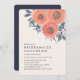 Feiern und danken Sie Ihren besten Mädchen vor dem großen Tag! Unsere wunderschönen Blumenbewohner laden zum Mittagessen mit eleganten Aquarellfarben-Blume in schicken Korallenpfirsichtönen ein. Das Design besticht durch ein Pappspray in der rechten oberen Ecke, umgeben von Blätter und Knospen in weichen Grüntönen, Grau und Blues. Fügen Sie Ihre Brautmädchen zum Mittagessen Details in modernen Mitternacht blau und grau Buchstaben. Der Hintergrund ist ein blasses Elfenbein.