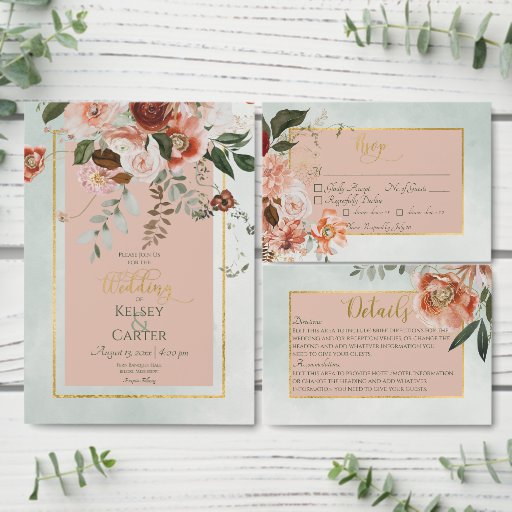 Dieses schöne pfirsich, rost, rot und grün Design ist auf einem weichen grünen Aquarell mit einem goldenen Rahmen aus Imitaten. Die Details sind im Zentrum des weichen Pfirsichs zu finden. Schön, elegant und rustikal. Diese Karte ist Teil der Peach & Rust Blume auf Green Watercolor Background Wedding Suite von Karten erstellt von Simply Farmhouse Press.