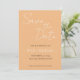 Einfache Hochzeit im Stile rette den aktuellen Einladungen, die weiße, stilisierte Schriften auf einem trendigen, pfirsichfarbenen Hintergrund enthalten. Bearbeiten und ersetzen Sie Namen, Datum und Position mit Ihrem eigenen. Wählen Sie Ihre Einladungsgröße und Ihren Papierstil aus.
