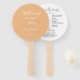 Hochzeitstag-Programm gedruckt auf einem runden Handventilator, der einen trendigen, pfirsichfarbenen Hintergrund auf der Vorderseite mit den Braut- und Bräutigamen in weißem, stilisiertem Skript aufweist. Auf der Rückseite des Programms sind die Teilnehmer der Hochzeitsfeier und die Zeremonie-Rites auf weißem Hintergrund mit dunkelgrauer Schrift aufgeführt. Bearbeiten Sie den Handventilator und ersetzen Sie die Informationen zum Hochzeitsprogramm durch Ihre eigenen. Ideal für eine Hochzeitsfeier im Innen- oder Außenbereich! Wählen Sie die gewünschte Anzahl von Hand-Lüfterprogrammen aus.