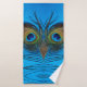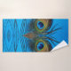 Vogelgesicht aus gespiegelten Pfauenfederbildern auf blauem metallischem Hintergrund.