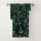 Lebhaftes, kaltes Pfauenhandtuch-Set. Dieses Design ist vollständig anpassbar und Sie können die Hintergrundfarbe von Schwarz auf Weiß ändern, um ein völlig anderes Aussehen zu erhalten. Die Produkte werden koordiniert!