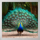 Ein regaler Pfau inmitten der üppigen Vegetation eines tropischen Dschungels, dessen eifrige Federn in atemberaubendem Aussehen erstrahlen. Die blauen, grünen und goldfarbenen Wolken des Absturzes schimmern im gedämpften Sonnenlicht und schaffen so ein faszinierendes Spektakel. Das dichte Grün des Dschungels bietet eine grüne Kulisse, die die Schönheit und Majestät des Pfaues unterstreicht.