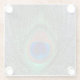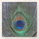 Ein nahes Aufsetzen einer Pfauenfeder auf grauem Hintergrund.