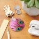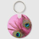 Schöner rosa Schlüsselanhänger mit bunten Pfauenfedern nah-up.
