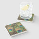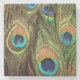 Ein Pfauenfeathers Stone Untersetzer mit einem Foto von einigen detaillierten Pfauenfedern.