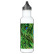Nahe Federn eines Pfauens auf einer Wasserflasche. Nehmen Sie ein wenig Natur mit auf Ihre Reisen.