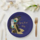 Pfauenpapier-Teller mit hübschen Pfauenfedern, Champagnerglas und eleganten goldenen Glitzer-High-Heel-Schuhen auf einem eigenen Farbhintergrund. Diese hübschen Peacock High Heel Schuhpapier-Teller lassen sich einfach an Ihre Veranstaltung anpassen, indem Sie einfach den von Ihnen gewünschten Text im Schriftart-Stil hinzufügen.
