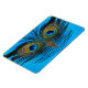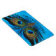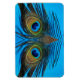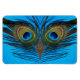 Vogelgesicht aus gespiegelten Pfauenfederbildern auf blauem metallischem Hintergrund.