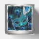 Pfauenmaskerade Gastgeschenk Box. Wunderschönes Gastgeschenk aus silber und königsblau mit wunderschöner aquamariner Federmaske auf einem eleganten, blauen Pfauenfederhintergrund.