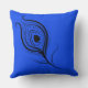 Kopfkissen mit Pfauenbild auf der Vorderseite und Silhouette der Pfauenfeder auf der Rückseite. Hintergrundfarben in tiefblau.