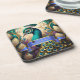 Atemberaubende Pfauen-Untersetzer mit wunderschöner poetischer Weisheit von Gabriel Foster auf einem blauen Goldband. Das Pfauendesign ist luxuriös, grün, blau, braun, lila, schwarz, weiß und ein paar andere Farben, einige gedämpft, einige hell. Entworfen, um phantastisch auf Ihrem Tisch auszusehen.