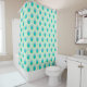 Grafischer Pfau inspiriert ovaler gemusterter Duschvorhang in aquamarin grünem Wasser, lila, blau und gelb. Ideal für ein modernes Bad. Moderne Grafik wiederholt gemustertes Design von Sarah Trett. www.sarahtrett.com für www.mylittleeden.com