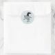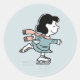 This circular Peanuts sticker features a classic winter scene set against a pale blue background. Lucy van Pelt is shown happily ice skating with a wide smile and her arms outstretched. She is bundled up in a blue or gray dress and a flowing pink scarf with fringed ends. The illustration captures her motion as she glides across the ice. This officially licensed sticker is a cheerful piece of winter-themed merchandise, perfect for fans who love the Peanuts characters, cold weather activities, or adding a nostalgic accent to notebooks and other belongings.