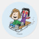 This circular Peanuts sticker features a joyful winter scene set against a light blue background. Peppermint Patty (with her distinctive freckles and wide grin) and her friend Marcie are shown happily sledding down a snowy hill. They are bundled up in winter gear—Patty in a green jacket and Marcie in a purple coat, with snow flying behind them. This officially licensed sticker is a cheerful, nostalgic piece of winter-themed merchandise, perfect for celebrating friendship, cold weather activities, or adding a touch of classic Peanuts charm to any item.