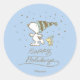 This charming, circular Peanuts sticker features a light, cool pale blue background with small brown dots suggesting gentle snowfall. Snoopy, the famous beagle, is walking cheerfully, wearing a long, striped winter hat in brown and light blue/teal with a pom-pom. Beside him, his best friend Woodstock is also walking, wearing a smaller, matching winter hat. The bottom features elegant, handwritten-style text in brown that reads: "Happy Holidays." This officially licensed sticker is a sweet, nostalgic piece of seasonal merchandise, ideal for decorating gifts, sealing envelopes, or simply celebrating the winter season with the classic charm of the Peanuts characters.