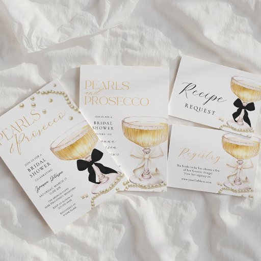 Mit dieser eleganten Brautdusche "Pearls & Prosecco" feiern Sie die zukünftige Braut. Mit einem zarten Coupe Champagner-Glas-Design mit eleganten Perlen und einem schwarzen Bogen-Detail strahlt diese Einladung Charme und Eleganz aus.