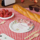 Round off your table decor with this romantic and chic paper plate featuring blush pink florals, pearls, champagne motif and gold accents — ideal for a bridal shower or brunch with timeless style.
