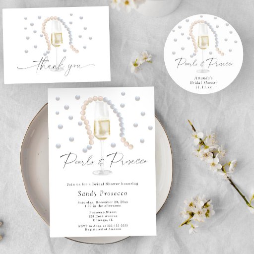 Aquarellpearls und Prosecco Bridal Dusche Einladungen. Schimmernde Perlen schmücken jede Karte. Champagnerglas in Wasserfarbe. "Perlen & Prosecco".