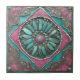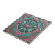 Rosa und türkisfarbene Kies Mosaikkunst aus türkisfarbenen und rosa Steinen, Set in Metallrahmen. Das zentrale Design ist ein kreisförmiges Motiv mit strahlenden Blütenblättern, umgeben von einem quadratischen Rahmen mit kleineren Motiven in den Ecken. Gut, um eine Ecke im Zuhause zu verschönern.