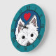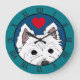 Niedlicher West Highland White Terrier, der aus einem kreisförmigen Design mit Herz herausguckt. Ihre Wahl der Randfarbe.