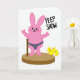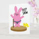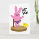 This design shows a bubblegum-pink bunny character standing on a round, earthy brown stage against a plain white background, posed like it’s putting on a flirty little show 🐰. One arm reaches out with an inviting, friendly gesture while the other hand holds a slim vertical brown pole, giving the scene a cheeky stage-act look without getting too serious. The bunny’s face is simple and sweet, with wide dark eyes, a small smile, and soft rosy cheeks that read like a knowing grin shared with the audience. It wears deep violet underwear patterned with small bright green four-petal flowers, adding a funny contrast to the cute character design. To the right at the edge of the stage, four fluffy yellow chicks huddle together, their heads tilted up as if they’re watching with curious admiration 🐇. Across the top, the words “PEEP SHOW.” appear in large, hand-drawn all-caps lettering in dark ink, centered and easy to spot. The overall art style uses flat shapes and strong outlines, keeping the colors crisp and the joke clear. The chicks’ tiny orange beaks and feet stand out against their sunny yellow bodies near the right side of the stage.
