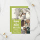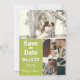 Foto Collage Save the Date in einem Retro-Typografie-Design und einer hellen pear grünen Akzent Farbe. Foto Save the Date mit drei Fotos personalisiert, Ihr Hochzeitstermin in fett-weißen Zahlen, und Ihre Namen in einem modernen Drehbuch.