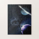 ein schwarzer Pegasus fliegt durch den Raum - eine schöne Weltraumszene mit einem blauen und einem lila Planeten und Sternen leuchten