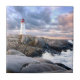 Peggy Buchtleuchtturm am Sonnenuntergang mit drastischen Wolken und einer Brandung.