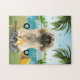 Pekingese Hund sitzend in der Nähe von Camper-Datei und Zelt mit Wohnwagen im Hintergrund auf Flussufer ist ein perfektes Rätsel, wenn Sie zum Camping gehen.