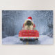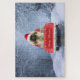 Pekingese Hund im Schnee sitzend im Weihnachtswage Puzzle
