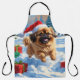 Pekingese Hund läuft im Schnee mit Weihnachtshut Schürze