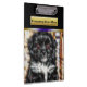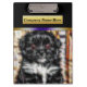 Ein niedlicher Hund, der dich mit seinen leuchtend roten Augen stehend auf einer Schiene ansieht, der Junge es ein schwarz-weißes Pekingese Welpe namens Peking